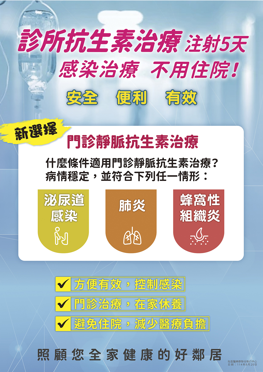首頁 > 最新消息 > 最新資訊 > 【✧新選擇】感染治療不用住院!門診也能打抗生素?