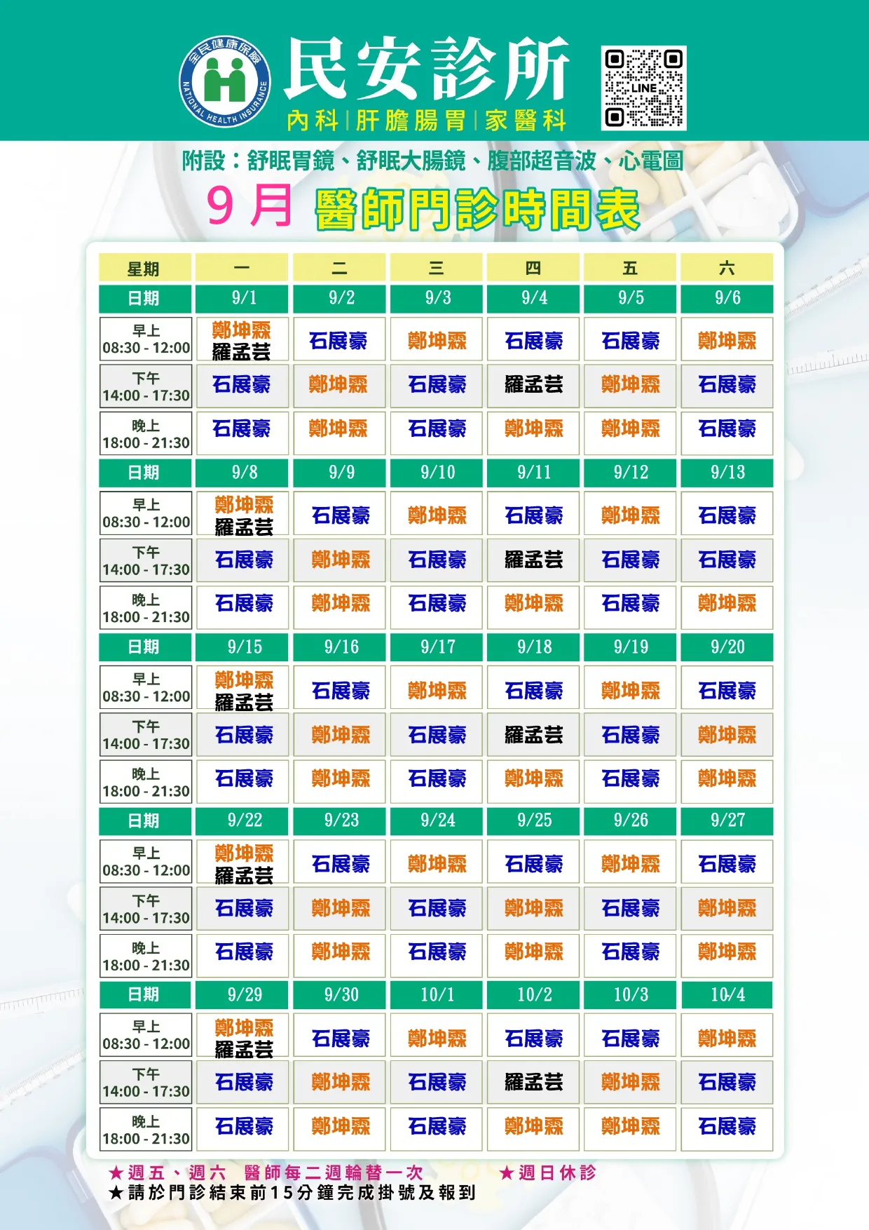 📢【民安診所|9月醫師門診時間表出爐!】📢
